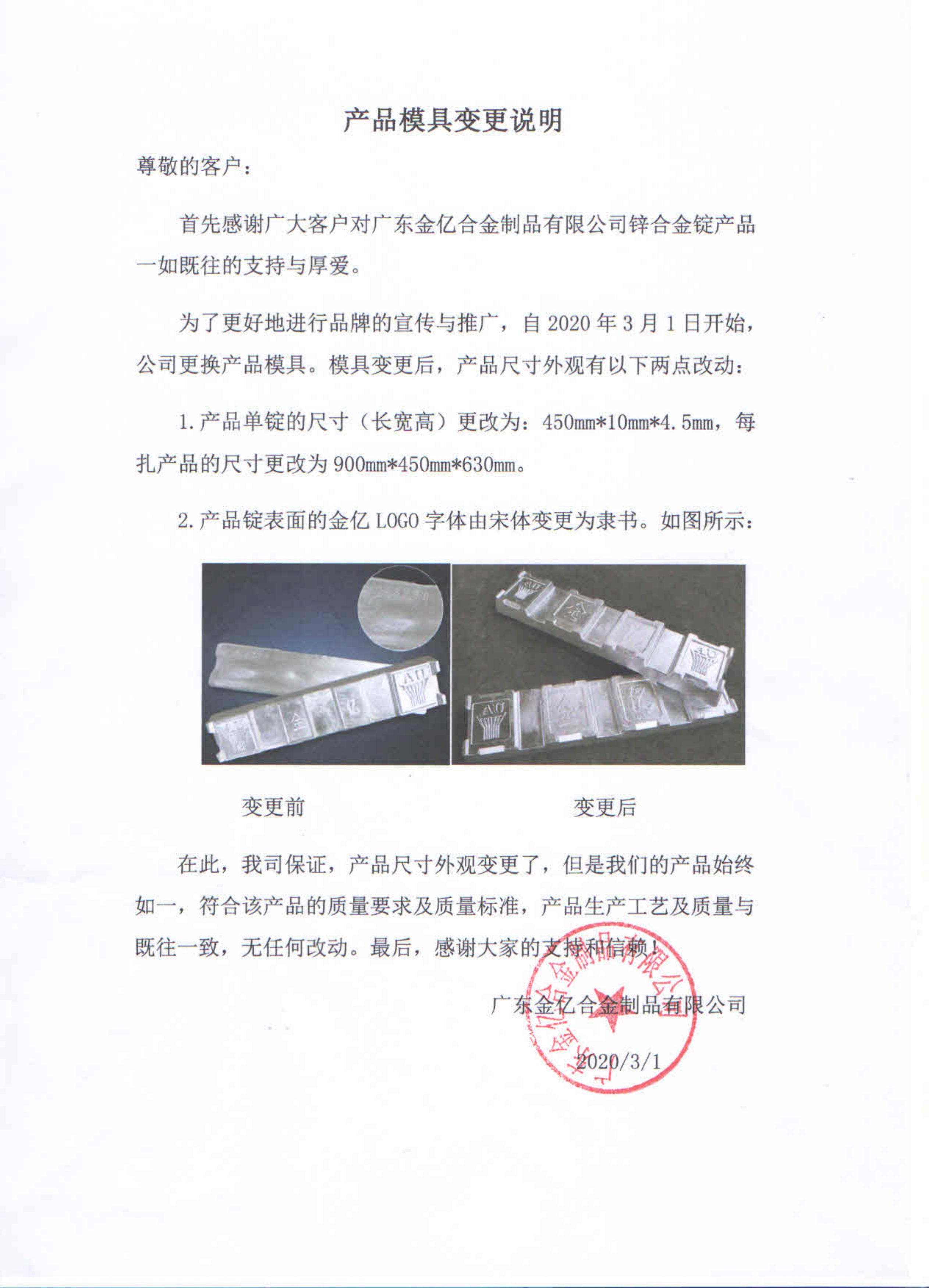 我司從2020年3月1日起變更鋅合金錠產(chǎn)品模具